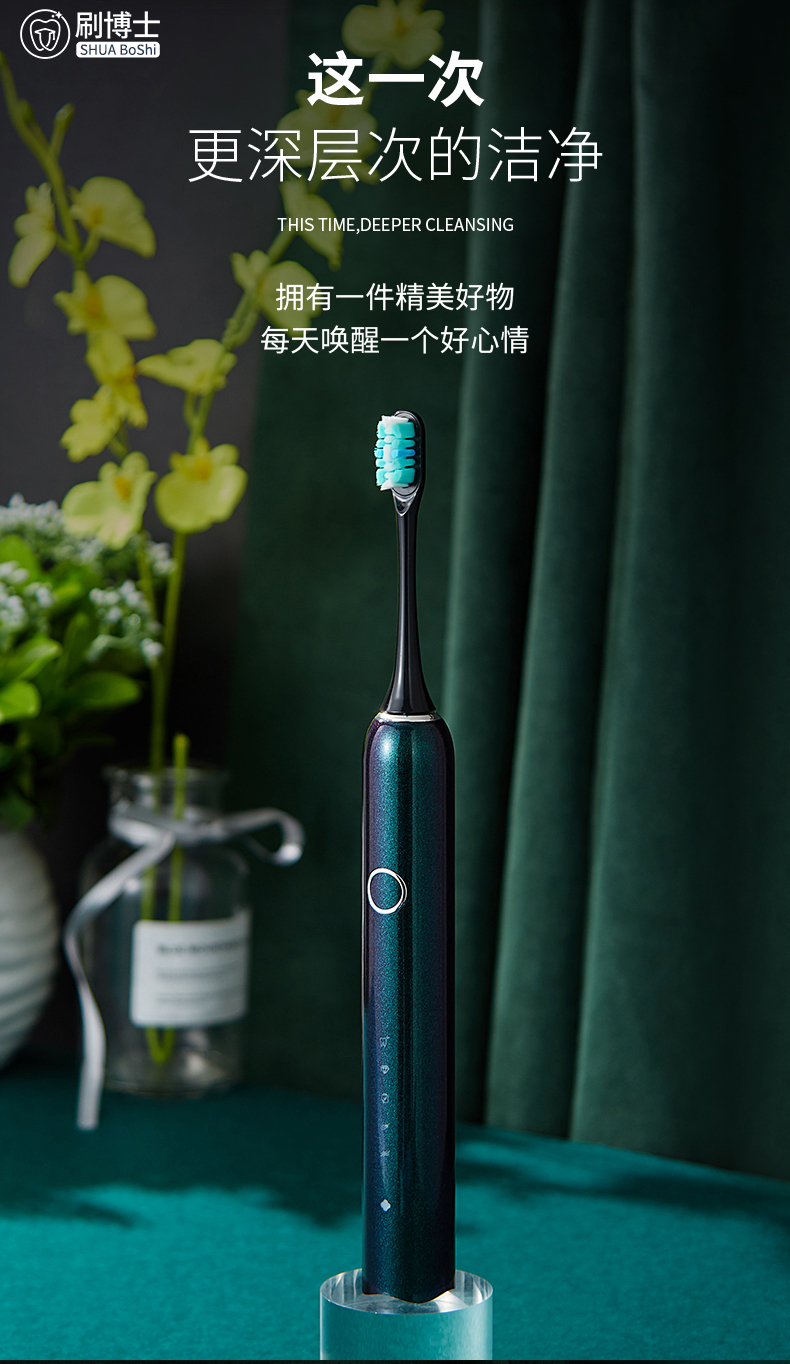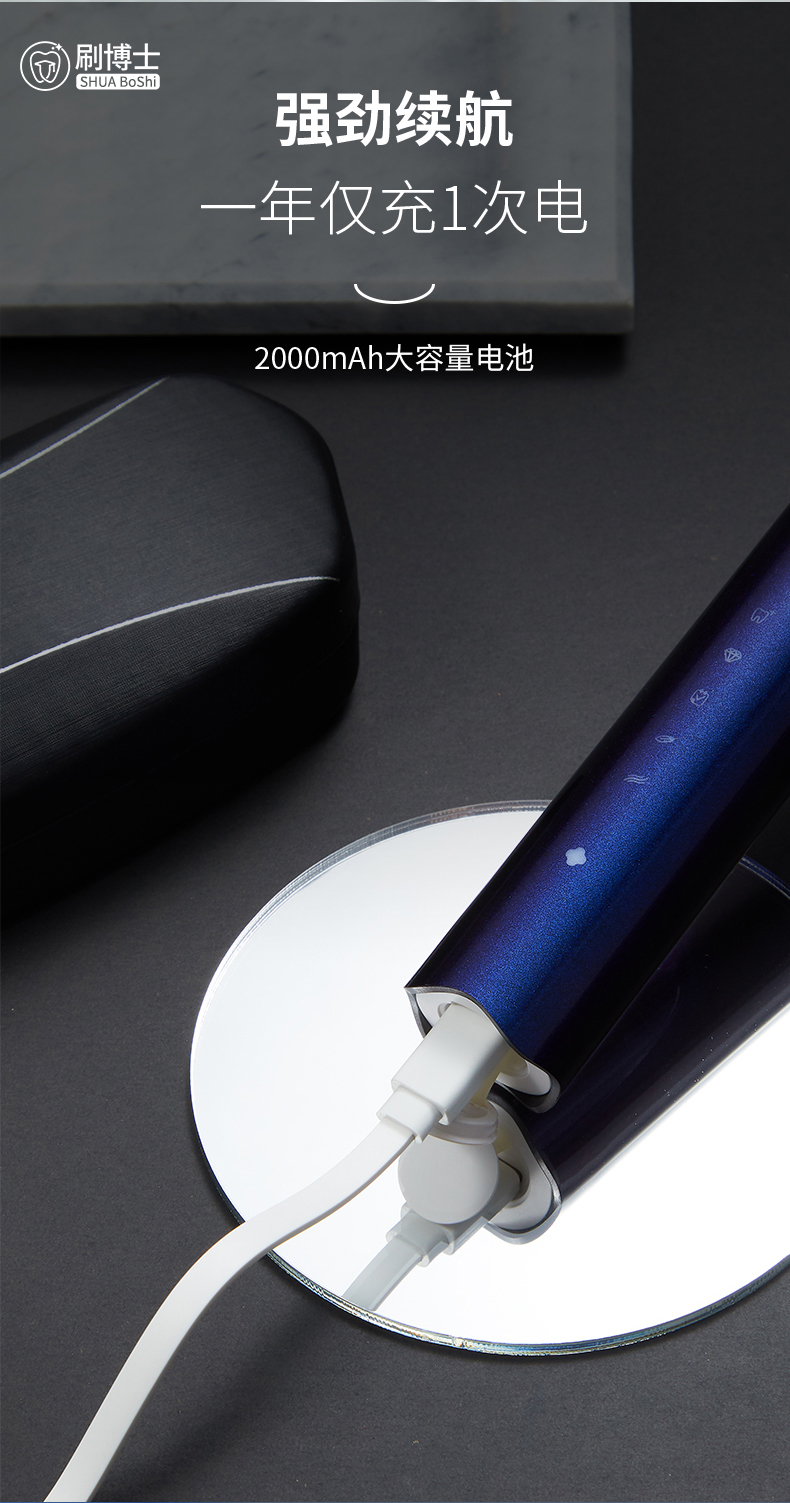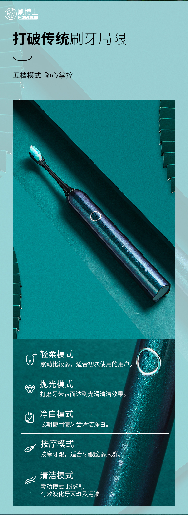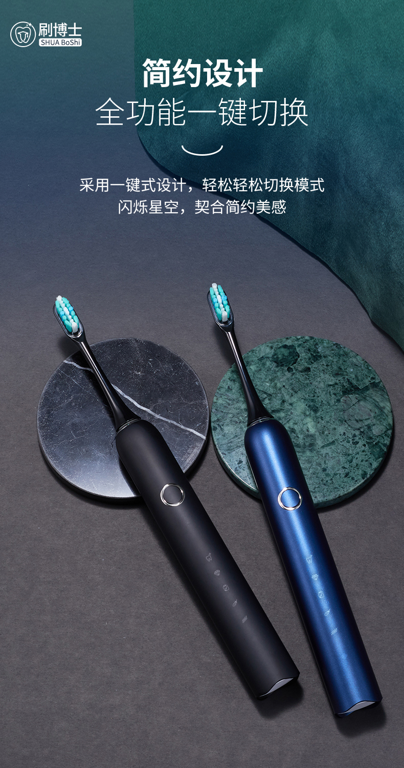刷博士【S300智能聲波電動牙刷】是一款集潔齒、護理及體驗煥然一新于一身的多功能聲波電動牙刷,采用一鍵式的簡約設(shè)計,5檔清潔模式,隨心掌控;此外,植入了模式記憶功能,牢牢記住你的刷牙習(xí)慣,下次刷牙,無需費時再次選擇;強勁的續(xù)航功能,一年僅充1次電;高顏值的顏色設(shè)計,皓月白、睿智黑、深邃藍等多種顏色選擇,遇上不同風(fēng)格的你。